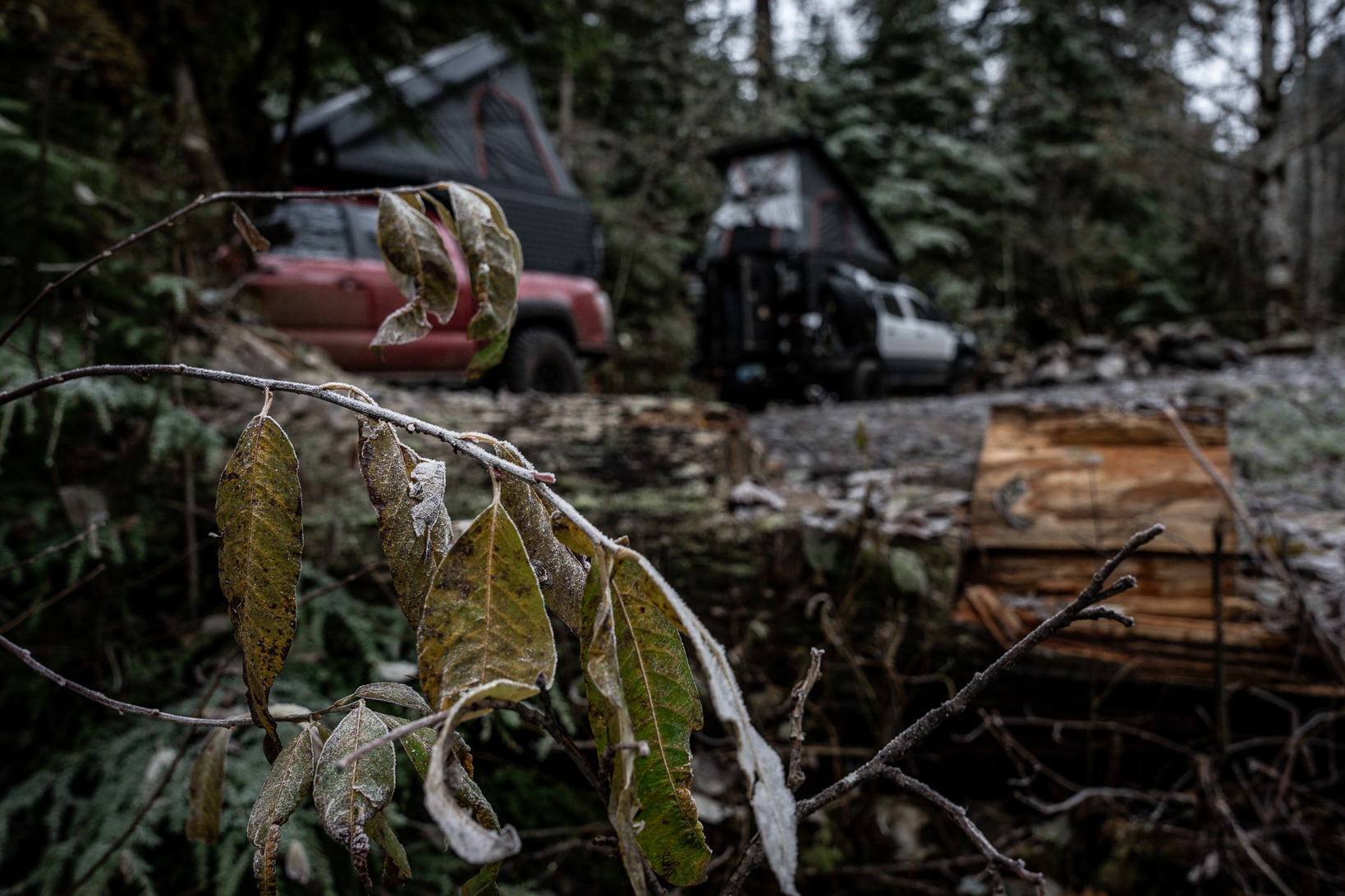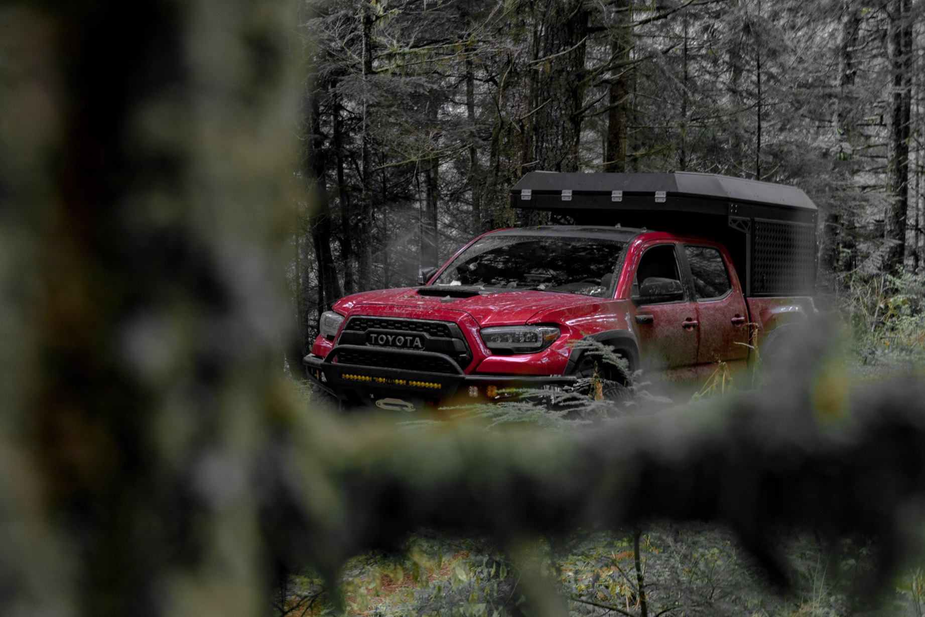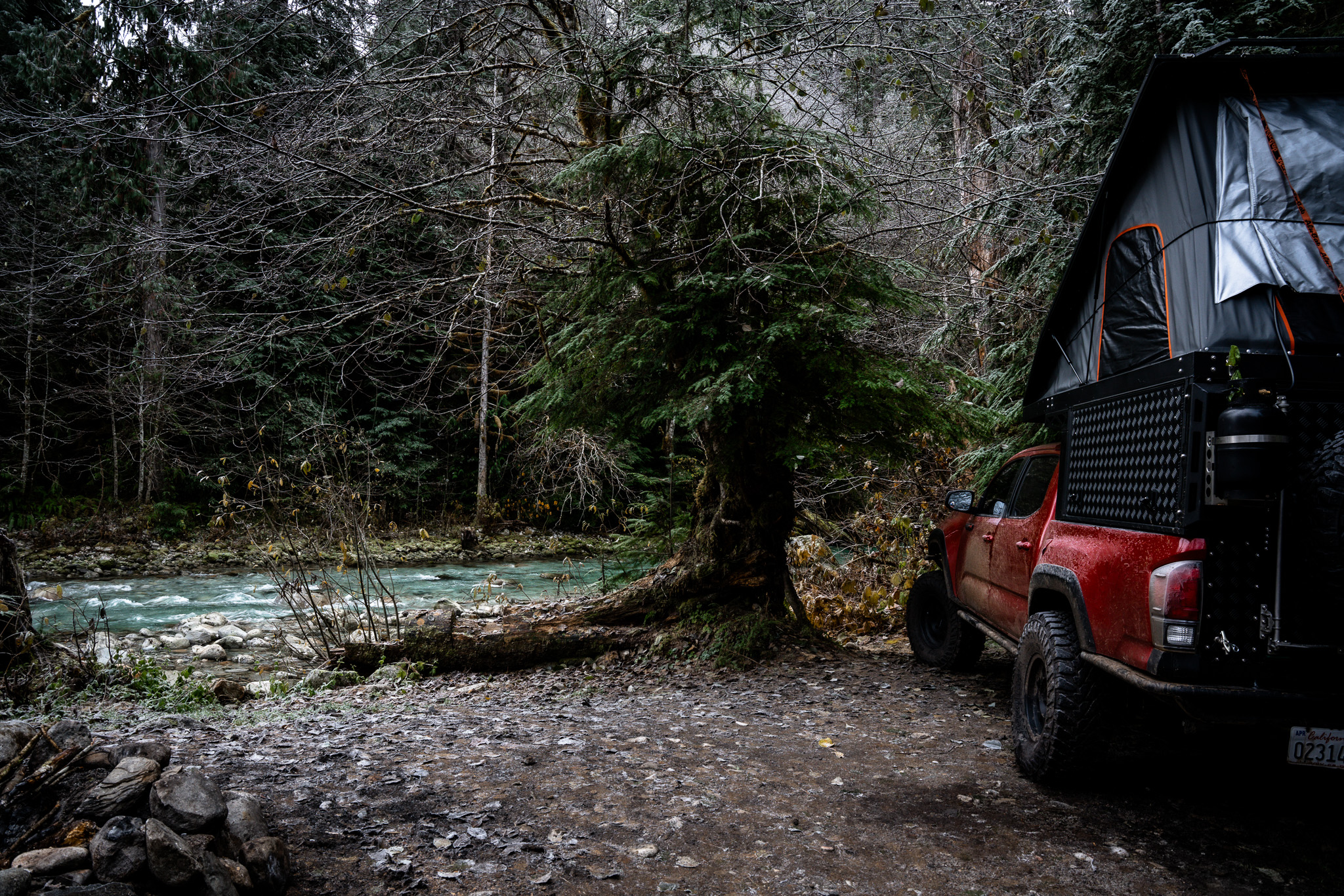 On that trip, we met up with a buddy, Haans, who happened to be an Alu-Cab installer from a different shop. We shared stories around the fire, swapped ideas about the perfect builds, and made sure to keep the pups warm. A customer recently told me his favorite thing about overlanding is spending time with quality humans around the fire and being knuckleheads. I think back to that night, and I can still feel the cold—the warmth of the fire on my hands and legs, and the chill of the wet air on my back. We spent the day covering pavement, making quick work of the absolutely beautiful national park. I snagged some photos at a stunning overlook just as the sun was setting, and we made our way out of the park toward some national forest to find camp. Haans led the way in his 2nd Gen Tacoma—a truck he started building while living in Alaska. Haans is one of those guys who can fix anything, with anything. His truck was older, wiser, and had definitely lived a full life, but it also had version one of the Alu-Cab Canopy Camper. That camper was about three years old... four years ago—and he still has it now, and he loves it. Driving in darkness through miles of overgrown forest roads, my wife was tired, mildly irritated with how much we had been driving, and ready to get to camp and eat dinner. She was also starting to feel a little scared. The forest was so dense that even with plenty of lighting, we could only make out the narrow dirt road ahead of us. I’ll never forget this moment. Haans jumped out to check a tight corner, then jumped back into his truck without saying a word and drove through what looked like a black hole. We waited for a minute to see if he would come back, and then he and Duke (his rad little pup—RIP Duke) came around the corner and gave us the thumbs up. My wife turned to me and said, “We’re not really staying here, are we?” Playing it cool, I replied, “Why not? This looks awesome.” But I’ll admit, I was a little sketched out too. When we pulled into camp, it felt tight and a little unsettling, but we could hear the river nearby. We made a quick meal, got the fire going, fed the pups, and settled in for some time around the fire. When we crawled into bed, we had no idea what to expect in the morning.