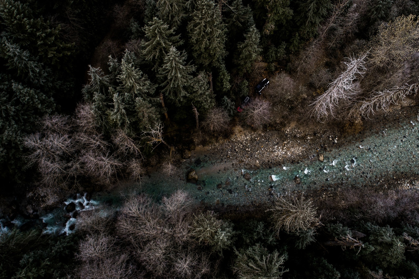 When we woke up, we were freezing. (No fireplace on the truck yet.) We unzipped the canvas and peeked out through the screens, and what we saw blew us away. A quick photo snapped through the screen with our iPhone doesn’t do it justice, but we couldn’t help but giggle with excitement. It was COLD. COLD COLD. The ground was frozen, the water we’d left outside was solid ice, and the moisture in the air from the river made it feel even colder than it probably was. We climbed down from bed and started our morning routine inside the camper. Let me just say, being able to stand up in a camper to get ready for the day—or for bed—is absolutely game-changing. It makes all the difference in the world, especially when it’s this cold. Back to nature... we stepped outside and were greeted by the most vividly colored water, framed by a dense wall of trees. The forest was so thick that we couldn’t see any of the surrounding mountains, so sending the drone up to get a feel for where we were was a thrill in itself. Enjoy the photos and videos from that morning—they’ll give you a glimpse of the magic we woke up to. But trust me, nothing compares to the feeling of arriving at camp in the dark and being completely blown away by the morning views.