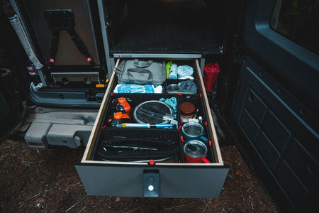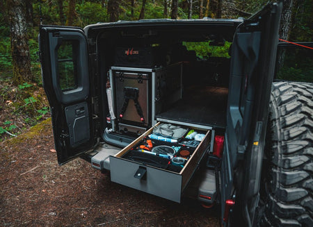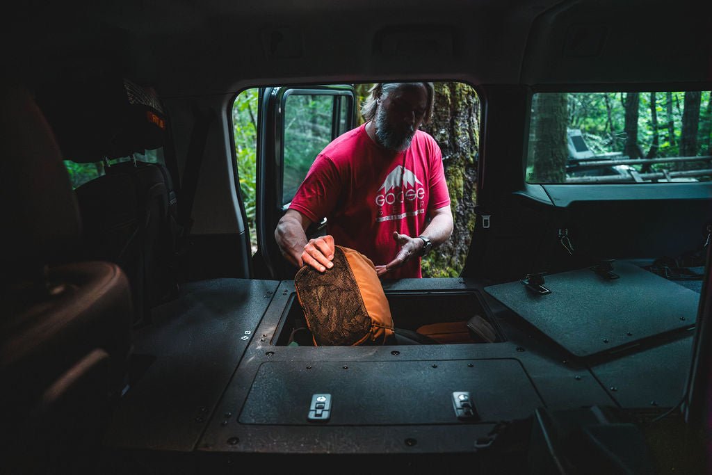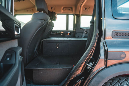 Brian's Favorite Sleep Package is a complete sleep solution for your Ineos Grenadier allowing for a single adult to sleep on the passenger side, add additional storage along with a mud room on the driver's side to allow for easy access and a convenient place to put your shoes, bags or even an additional strap down a fridge.